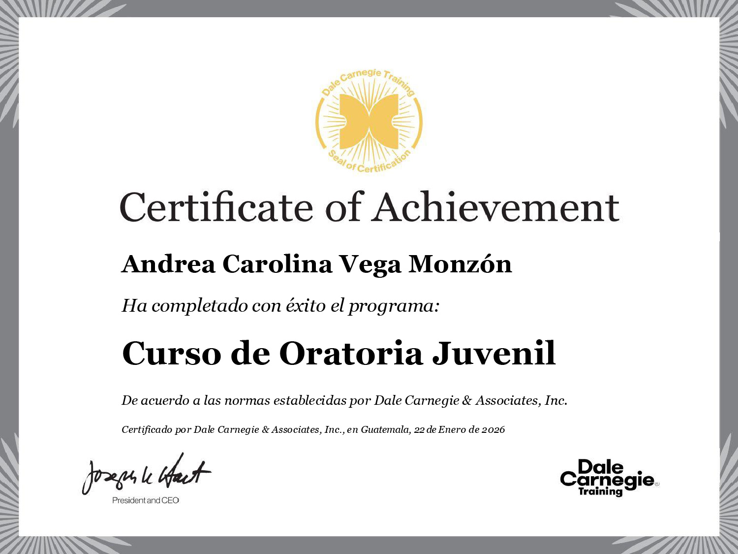 Al concluir el programa, obtiene un certificado oficial emitido por Dale Carnegie, que respalda su formación y certifica sus competencias con reconocimiento y validez internacional.