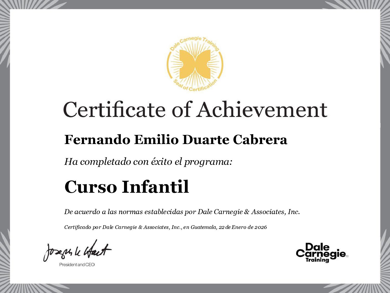 Al concluir el programa, obtiene un certificado oficial emitido por Dale Carnegie, que respalda su formación y certifica sus competencias con reconocimiento y validez internacional.