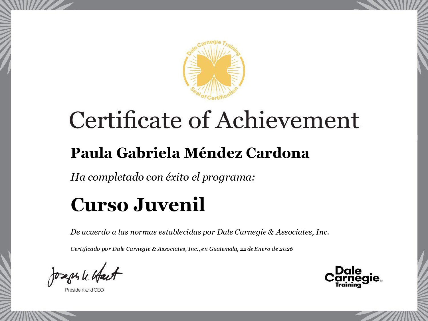 Al concluir el programa, obtiene un certificado oficial emitido por Dale Carnegie, que respalda su formación y certifica sus competencias con reconocimiento y validez internacional.