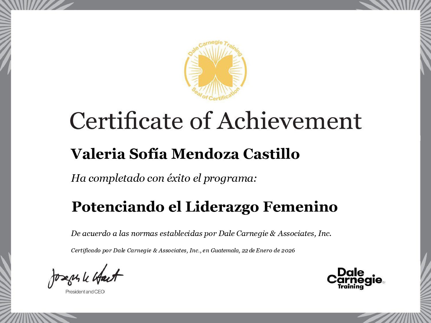 Al concluir el programa, obtienes un certificado oficial emitido por Dale Carnegie, que respalda tu formación y certifica tus competencias con reconocimiento y validez internacional.