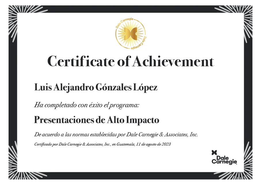 Al concluir el programa, obtienes un certificado oficial emitido por Dale Carnegie, que respalda tu formación y certifica tus competencias con reconocimiento y validez internacional.