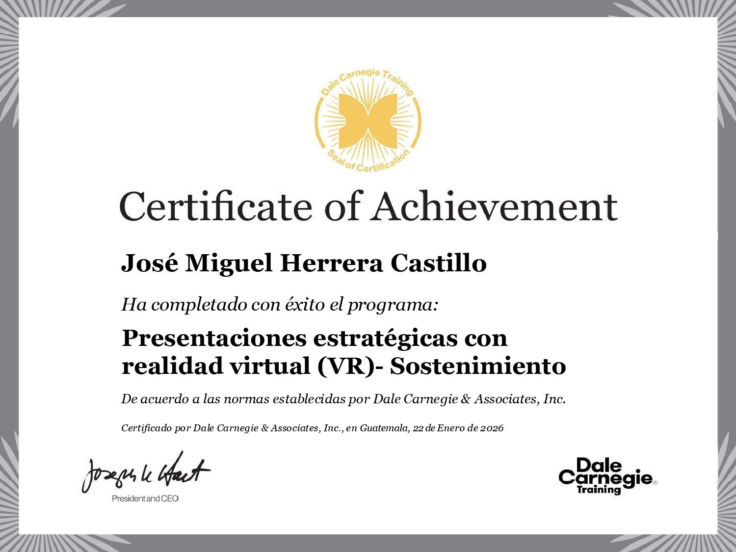 Al concluir el programa, obtienes un certificado oficial emitido por Dale Carnegie, que respalda tu formación y certifica tus competencias con reconocimiento y validez internacional.