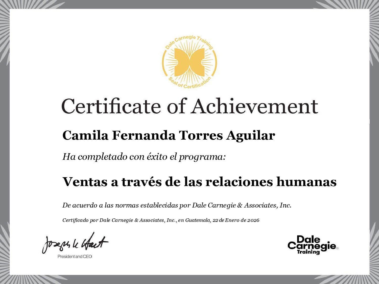 Al concluir el programa, obtienes un certificado oficial emitido por Dale Carnegie, que respalda tu formación y certifica tus competencias con reconocimiento y validez internacional.
